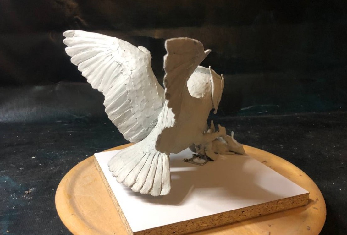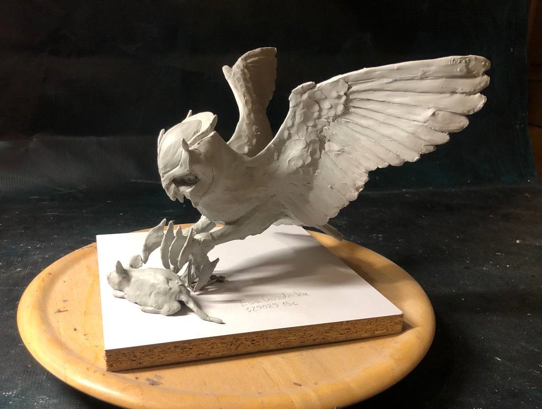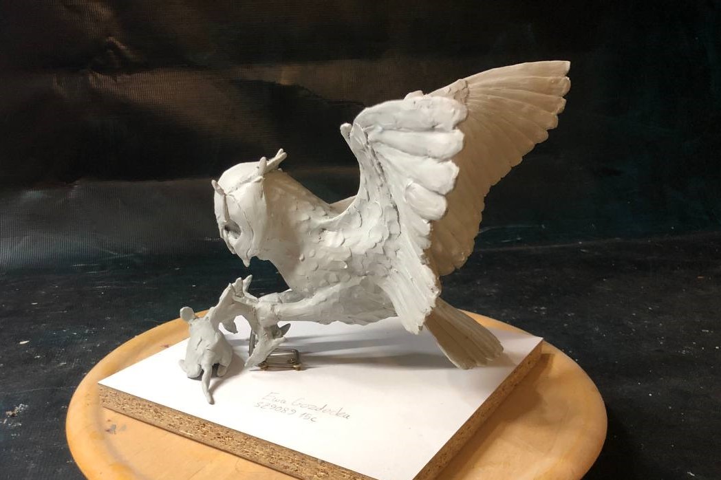 Rzeźby Sowa z filmu Legendy Sowiego Królestwa polująca na mysz. Praca wykonana w trakcie procesu edukacyjnego na PJATK. Wpomnienia. Asamblaż. Praca wykonana w trakcie procesu edukacyjnego na PJATK.